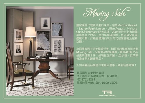 麗居國際位於建國南路二段的大安旗艦店,因為租約到期,我們計畫在此階段另外打造一處更新穎、優質的商品展售空間,因此決定趁著搬家之前,舉辦門市搬遷特價Moving Sale!