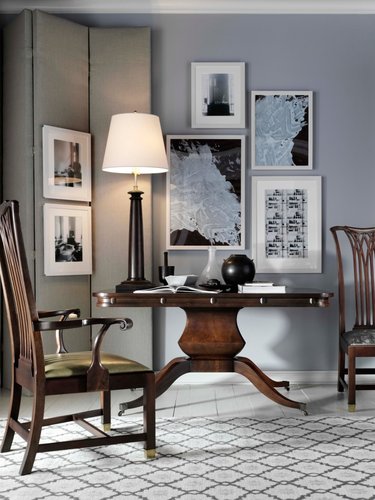 圖片為Hickory Chair攝政風格寫字桌Barbara Writing Table,桌柱在中心點的設計,在視覺上多了變化感,可在沙發背後打造開放書房區域,現品唯一一張特價4折喔!