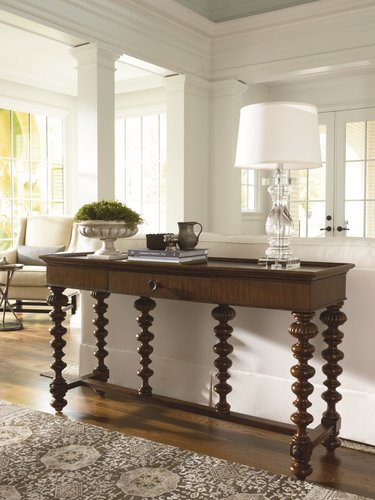 至於這張尺寸秀氣的沙發背桌,雖然深度僅有48公分,但十分講究地安排了6支腳柱,呈現高貴典雅的特色。重複的球結雕刻裝飾,亦為英國喬治王朝時期延續下來的裝飾手法,烘托Hemingway