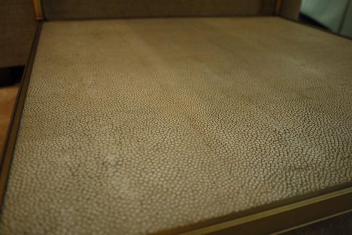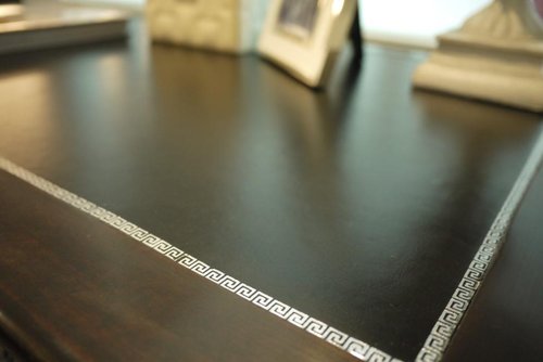 銀漆描繪的希臘式回字圖騰,內斂區隔木質結構及嵌有皮革的寫字區。