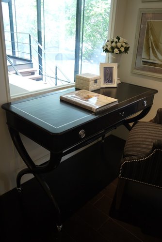 新品中這張Lennox寫字桌充分展現,品牌熱衷結合法式傳統及時尚的手法。雖然X型桌腳是拿破崙時期主流,但安靜的黑色烤漆、桌面嵌黑色皮革,以及邊緣以銀漆描繪希臘式回字圖騰裝飾,都讓它顯得低調雋永,並非誇張富麗的裝飾手法,更容易融入當代家居場景。