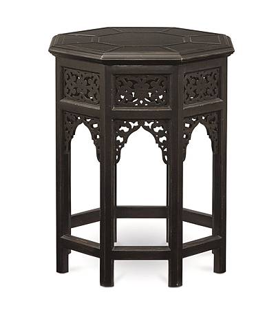 Thomasville八角型邊桌,因為鏤空雕花造型靈感來自於中東建築,也替時尚的漆黑色添入神秘色彩。