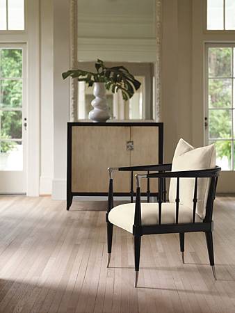 Black Beauty扶手椅,自英國傳統家具溫莎椅變形,改以黑色椅身鑲嵌金屬飾邊,配上柔軟潔淨的米白色座墊,呈現亦剛亦柔的單純黑白色調。