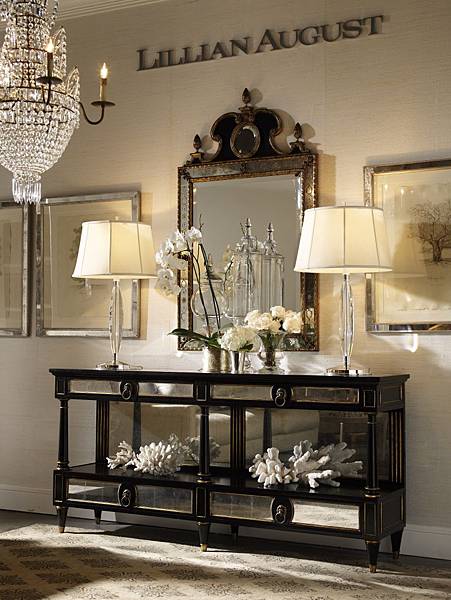 這件Lillian August的玄關桌,是非常搶眼的法式懷舊單品,利用反射璀璨光芒的仿鏽銀鏡,並於鏡面和木器邊緣,手繪金漆描邊的線條,勾勒出十足的典雅氣勢。