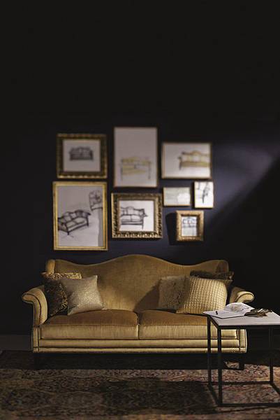 從這張圖片可以更清楚地看出,澄金色三人沙發的優雅輪廓,雖然是全金的布料色澤,但微微的光澤感,以及素面無緹花的典雅材質,讓整體看起來是時尚的。