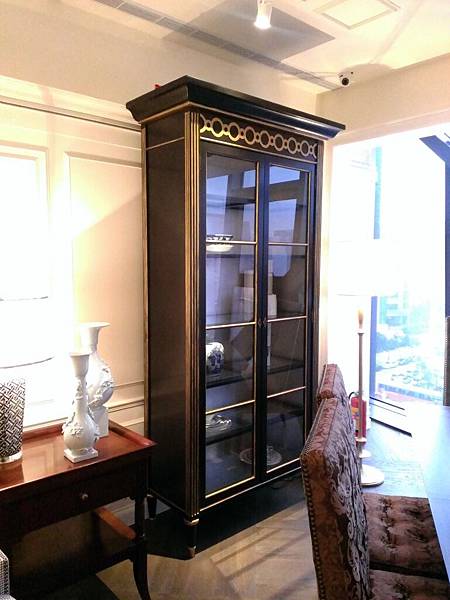 如果想帶金,但又希望色彩更低調一些,則可以考慮Lillian August這款餐櫃,木器部分採用黑色漆面,對比折衷主義的手描金漆裝飾線條,也顯得沉穩氣派且落落大方。