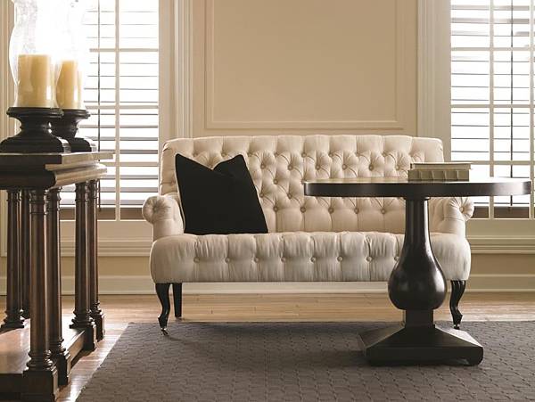 典型古典風格的釘釦元素,應用在體積不大的雙人沙發上,看起來優雅而不顯繁複累贅。很適合在書房或客廳角落,另外布置這處輕鬆閱讀座位區。