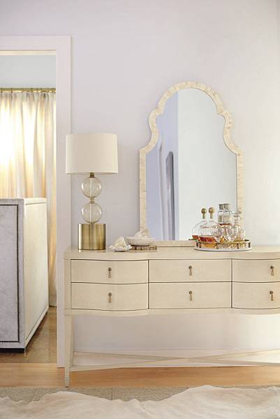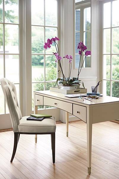 另一款奶油白寫字桌,也是Bernhardt新品,在抽屜和桌面邊際勾勒一道褐色線條,就像描繪了眼線一般,整體看來更顯俐落高雅。