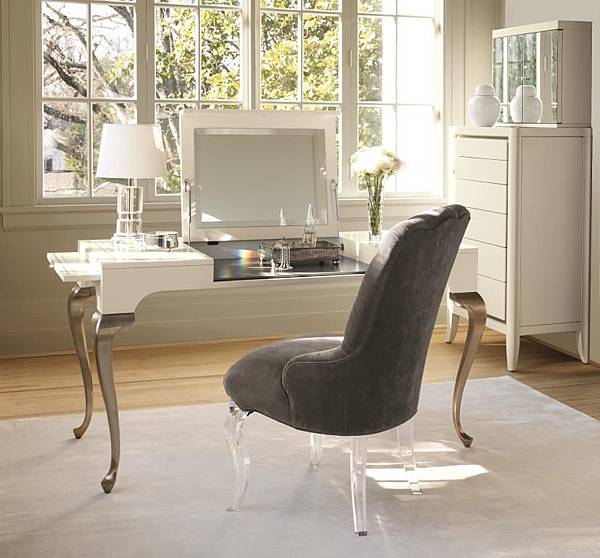這款象牙白的Caracole新品寫字桌,則是以內藏機能取勝,掀開桌蓋化身成古典化妝桌,側邊還有暫時置物的伸縮桌板。