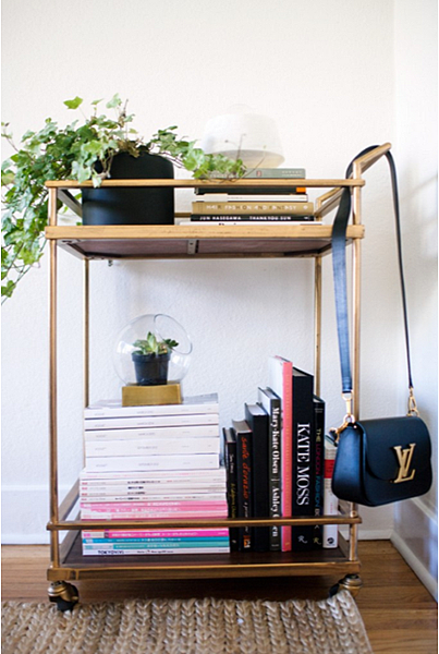 將書籍 雜誌整齊擺放、再以綠色植物點綴,最後隨興的掛上包包,